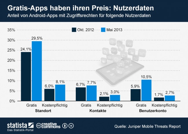 Erst gestern berichteten wir darüber, dass die Facebook-App Handy-Rufnummern der Nutzer klaut. Leider ist Facebook kein Einzelfall. Juniper Networks veröffentlichte jetzt eine alarmierende Statistik: Diese zeigt, dass kostenlose Apps um ein Vielfaches öfter auf persönliche Daten zu greifen als ihre kostenpflichtigen Pendants.