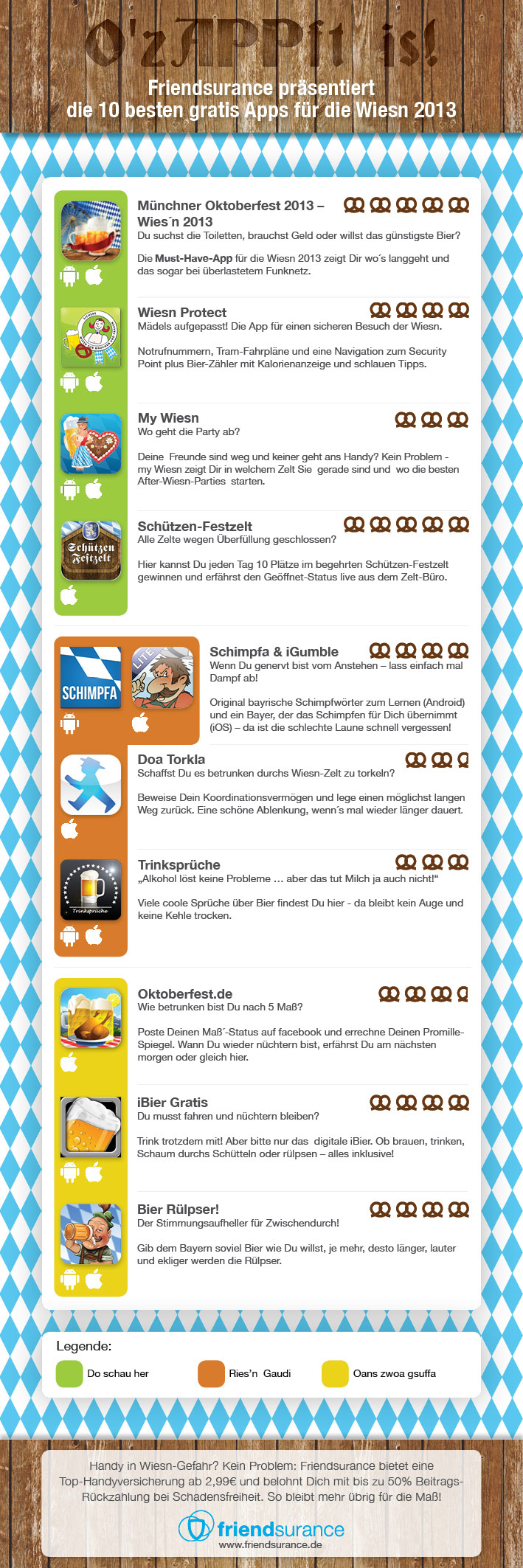 Es wird kälter, der Herbst kündigt sich an. Demnach wird es Zeit für die Wiesn und das Oktoberfest. Ab Samstag dem 21. September hat die ”Wiesn” auf der Theresienwiese in München wieder geöffnet. Friendsurance, ein Versicherungsunternehmen das auf Handy- und Smartphone-Versicherungen spezialisiert ist, hat pünktlich zum Feststart des 180. Münchner Oktoberfestes die besten Oktoberfest-Apps für Android und iOS gekürt.